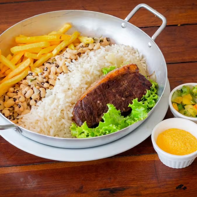 Maminha Argentina assada na brasa, Acompanhada de feijão macassar, arroz branco, batatas fritas douradas e crocantes, pirão de queijo, farofa da casa e vinagrete.