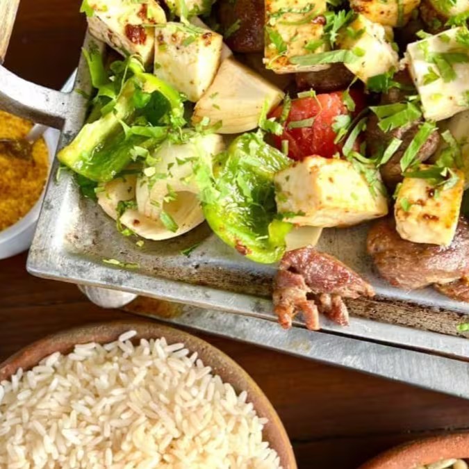 Combinação suculenta de carnes na brasa: maminha, carne de sol, toscanas suína e de frango, meio galeto e queijo coalho grelhado. Acompanha arroz branco, feijão tropeiro, pirão de queijo, batatas fritas crocantes, farofa da casa e vinagrete fresco. Ideal para almoço ou jantar, com frete grátis.
