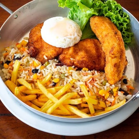 Filé de frango suculento na brasa, empanado e servido com bananas à milanesa e ovos à la coque. Acompanha arroz à grega e batatas fritas crocantes. Uma ótima pedida para almoço ou jantar, com frete grátis.