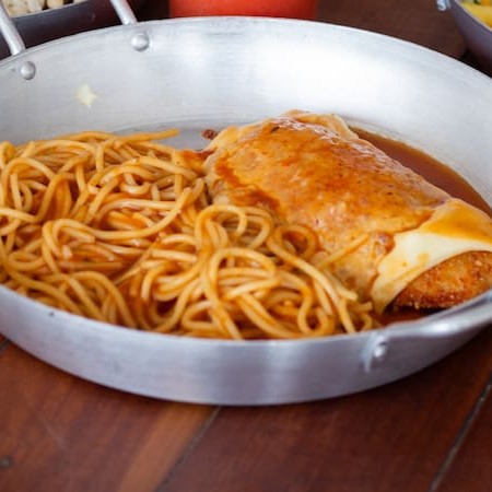 Almoço Parmê de Frango - Espagetti ao molho pomodoro, frango empanado e regado ao queijo mussarela e molho. ---------------------------------tags--------------------------- #promoção #fretegratis #0,99 #7,99 #9,99 #19,99 #campanhainteligente #hits #almoço #desconto
