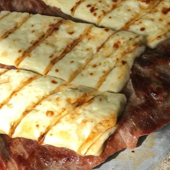Carne de sol suculenta na brasa, finalizada com queijo coalho derretido. Acompanha feijão macassar, arroz branco, batatas fritas crocantes, farofa da casa e vinagrete fresco. Ideal para almoço ou jantar, com frete grátis.