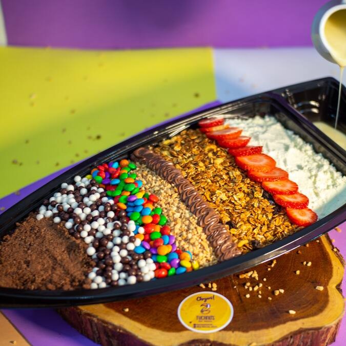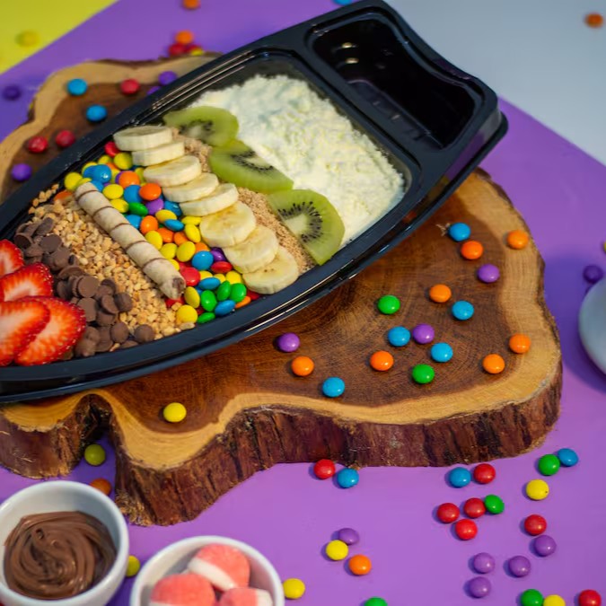 A barca é sensacional para você aproveitar 3 sabores diferentes em 600ml de açaí e/ou gelato. Com muitas opções de acompanhamentos. Aproveite e use sua criatividade para montar do seu jeito com opcionais premium. Junta a galera e aproveita.