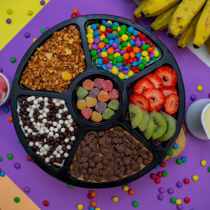 1100ml da nossa excelente Roleta Feliz com açaí e/ou gelatos, você pode aproveitar até 5 sabores diferentes. Com muitas opções de acompanhamentos. Aproveite e use sua criatividade para montar do seu jeito com opcionais premium. Junta a galera e aproveita.