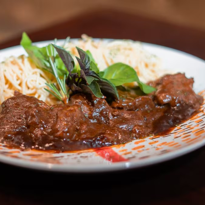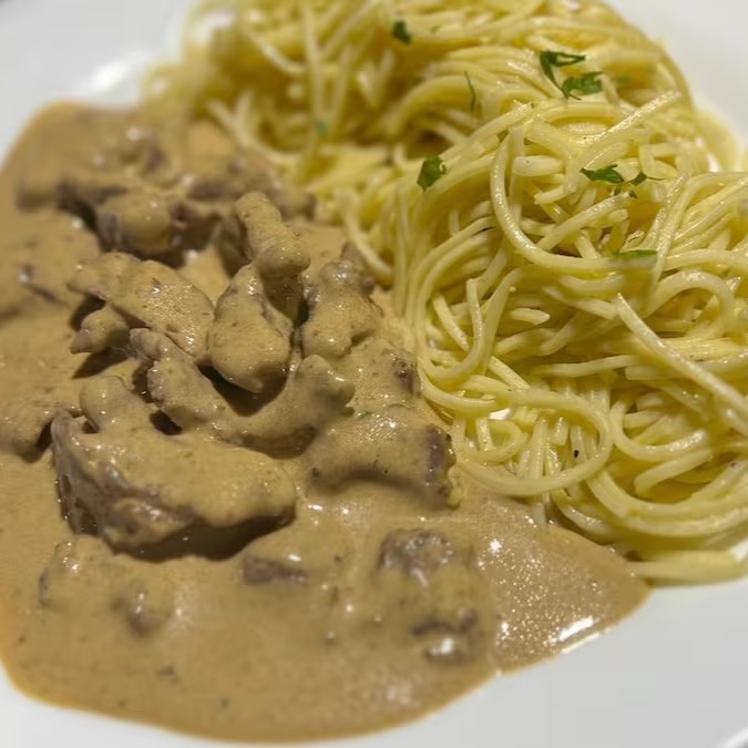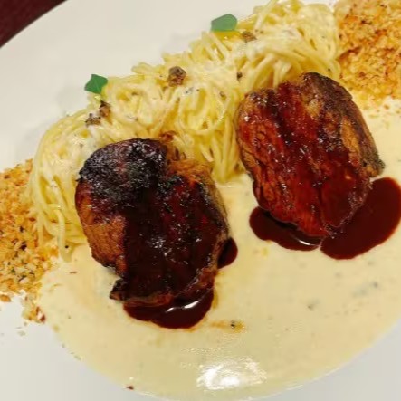 Escalope de filé mignon ao molho escuro com toque de gorgonzola acompanhado de massa caseira fresca.