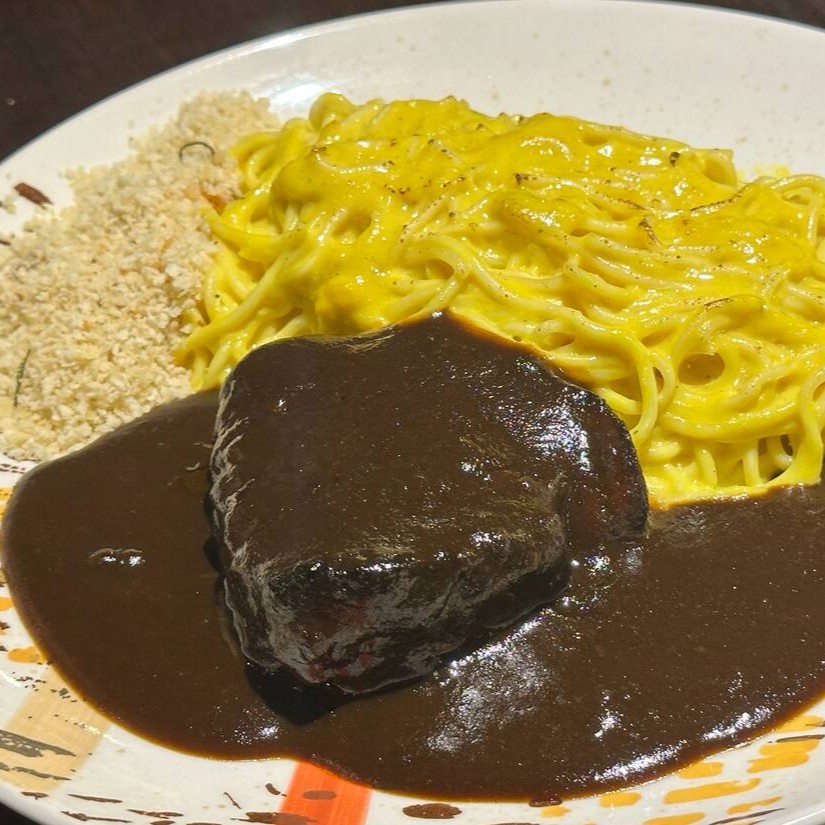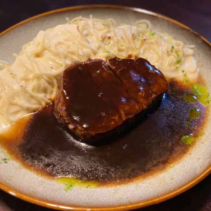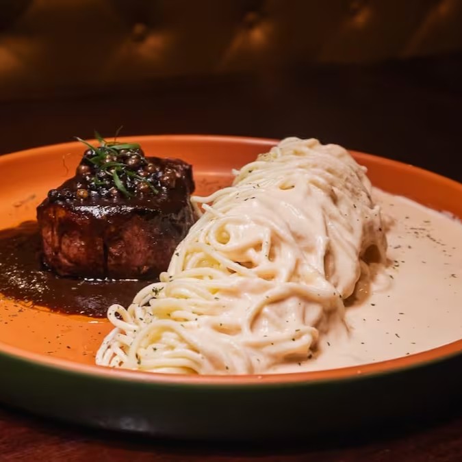 Medalhão de filé ao molho roti e pimenta do reino servido com massa caseira ao molho parmesão.