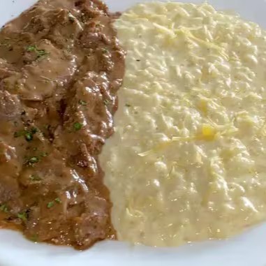 Escalope de filé ao molho roti, acompanhado de risoto de queijo parmesão .