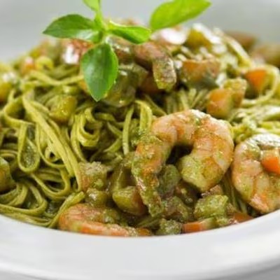 Massa caseira e camarões ao molho pesto.