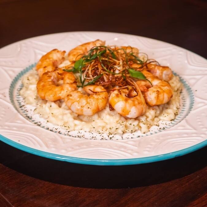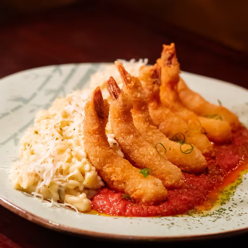 Camarões envoltos em massa especial crocante, servidos sobre risoto de de grana padano e contraste de molho de pomodoro pelati italiano com perfume de majericão.