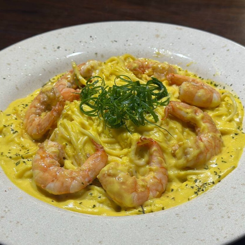 Camarões flambados acompanha massa caseira ao servida com molho de mostarda e Catupiry.