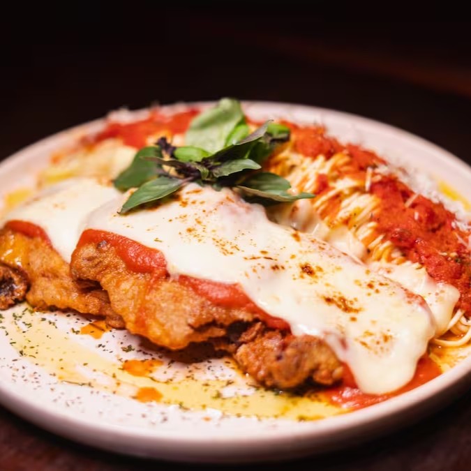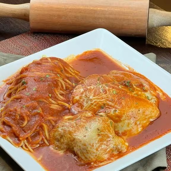 Filé mignon a parmegiana servido com massa artesanal com molho de tomate caseiro.