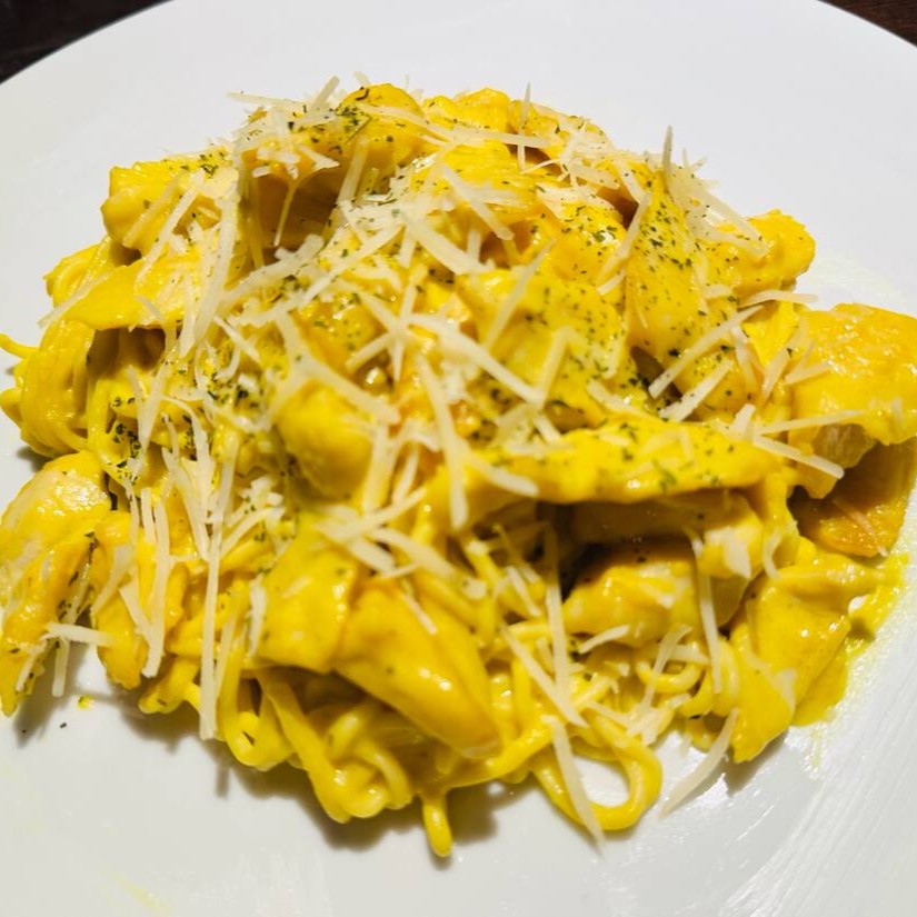Filé de Frango ao molho parmesão e massa caseira artesanal.