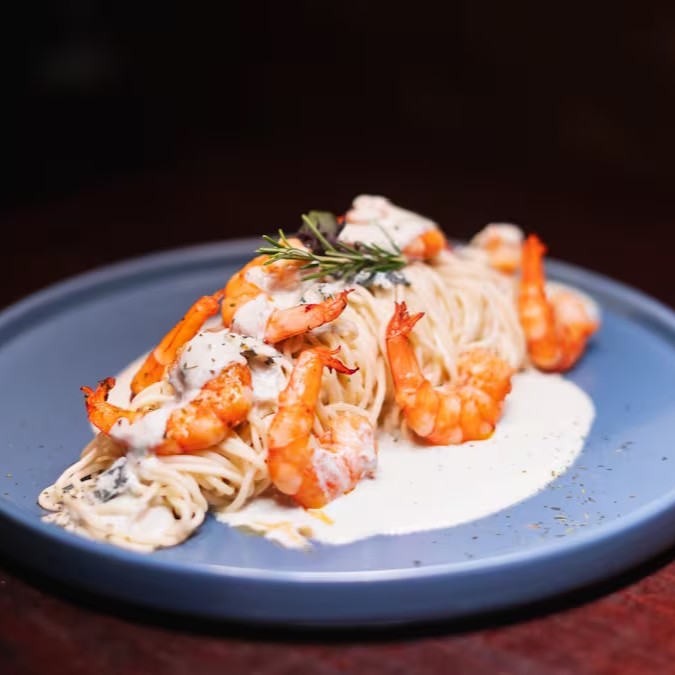 Camarões salteados na manteiga, molho de gorgonzola e creme de leite fresco, acompanhado por linguine caseiro