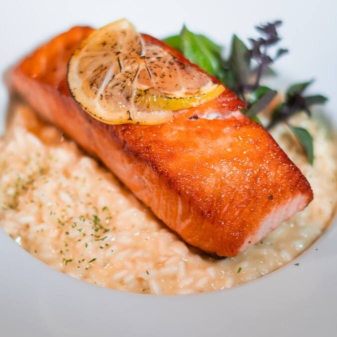 Filé de salmão grelhado com toque adocicado e risoto cremoso de parmesão.