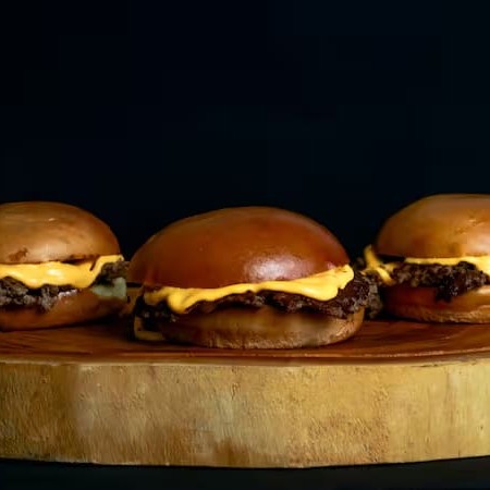 Pão brioche selado na manteiga, maionese da casa, 2 blends80g (cada) fraldinha e queijo cheddar cremoso.