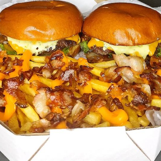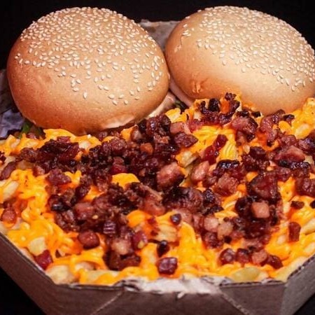 “2 Burguer's artesanais suculentos + batata frita turbinada com cheddar cremoso, bacon crocante.. Combo perfeito pra dividir (ou não ).