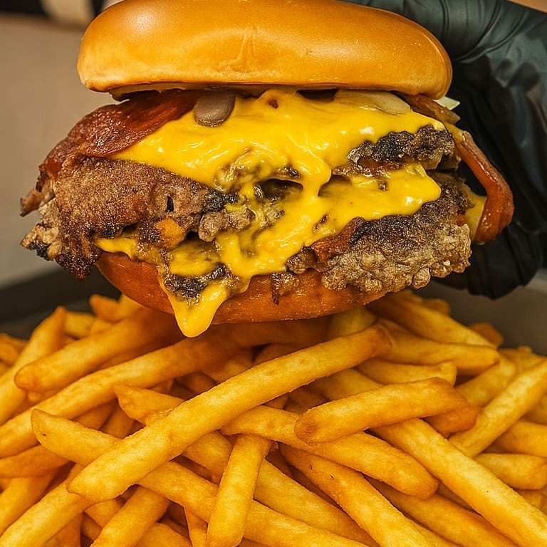 Pão Brioche fofinho, cheddar cremoso,3 Carnes smashs 60g,molho da casa que todo mundo ama e bacon crocante. Acompanha uma porção de batata frita individual pequena.