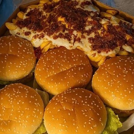 “5 Burguer's artesanais suculentos + batata frita turbinada com cheddar cremoso, bacon crocante.. Combo perfeito pra dividir (ou não ).