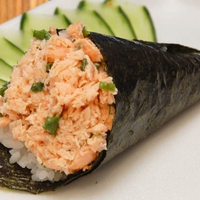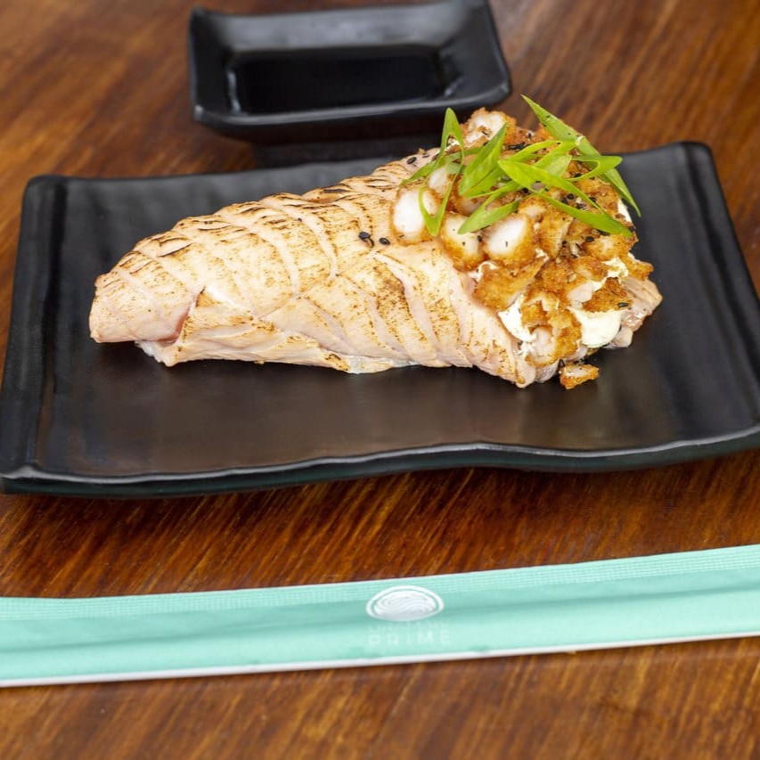 Generosa manta de salmão maçaricada, camarões empanados, cream cheese, e arroz. Peso Aproximado, podendo variar para mais ou para menos.