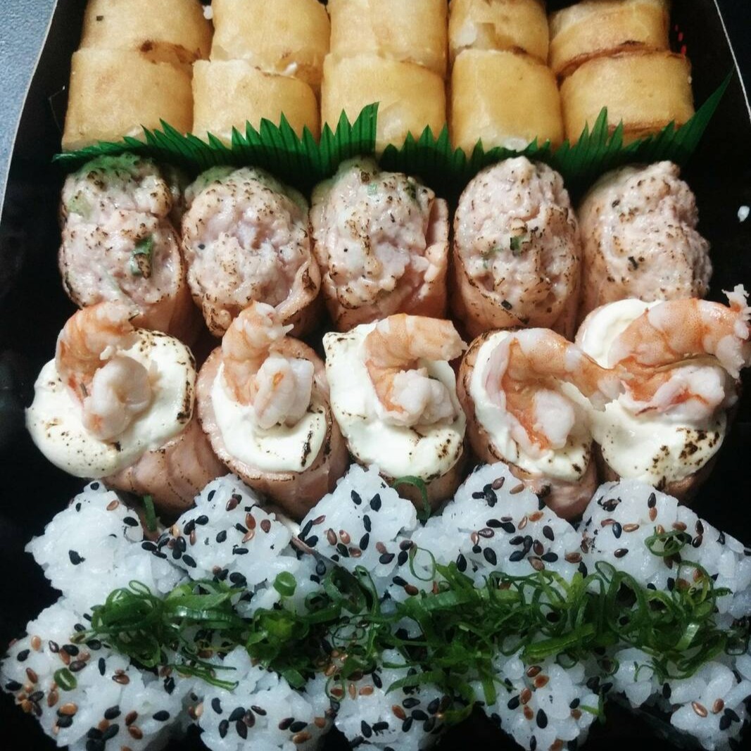 10 uramaki salmão, 10 harumaki salmão, 5 jojo's e 5 ebi jo's. Inalteráveis