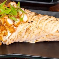 Generosa manta de salmão maçaricada, camarões empanados, cream cheese, e arroz.