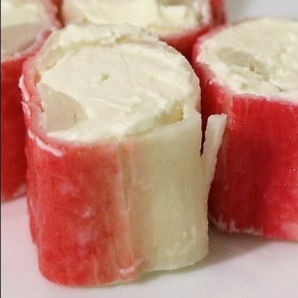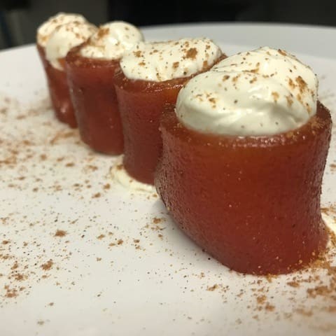Finas fatias de doce de goiaba enroladas em cream cheese. Finalizados com canela.