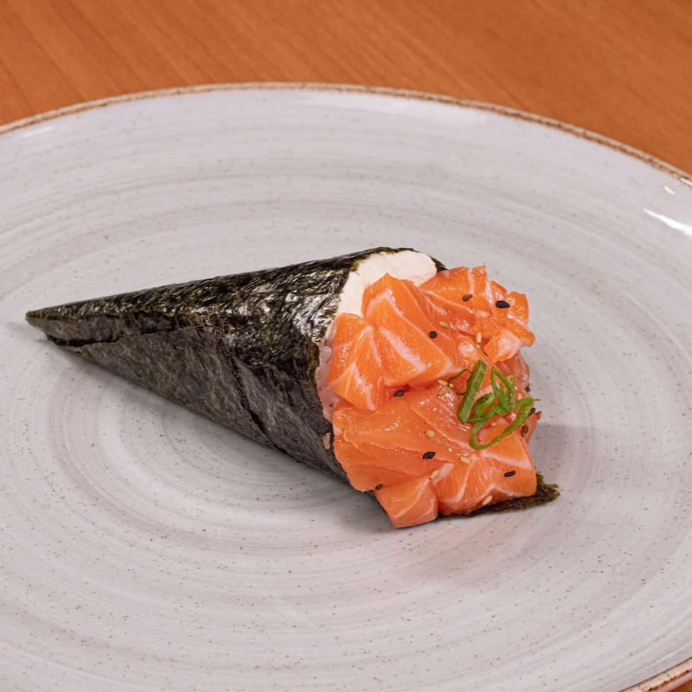 Roll feito de massa crocante recheado com salmão e cream cheese, cebolinho e gergelim. Sem arroz