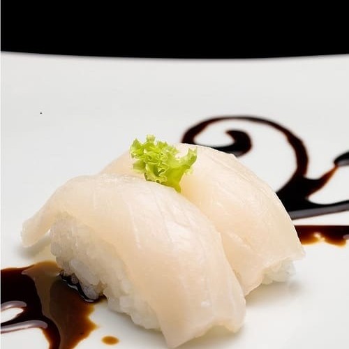 Lâmina de peixe branco(prego) sobre porção de arroz.
