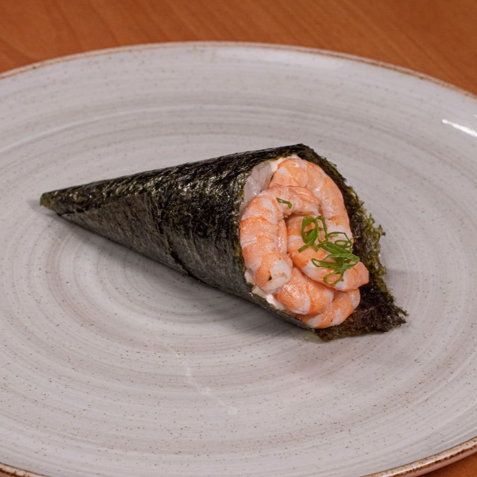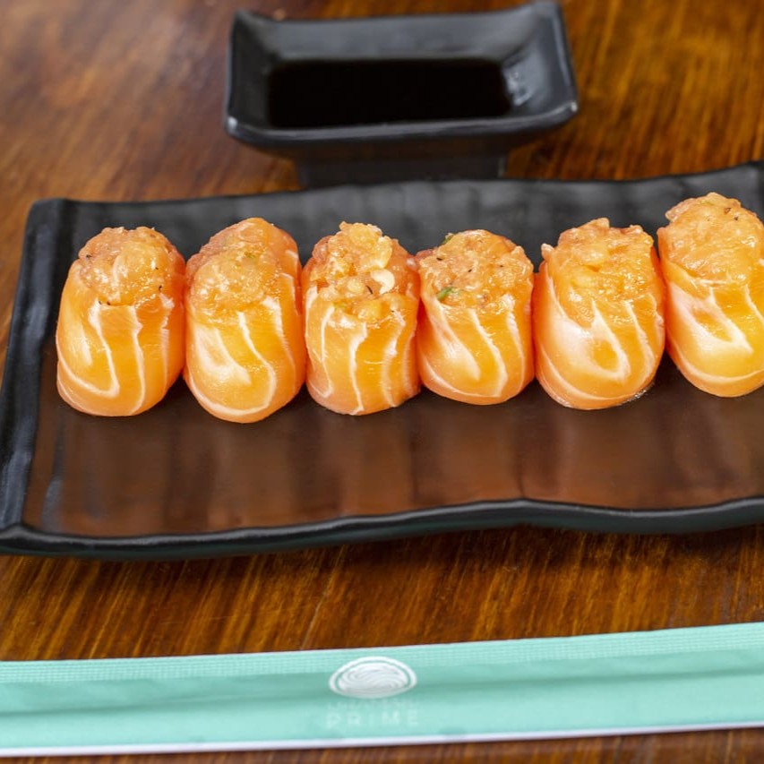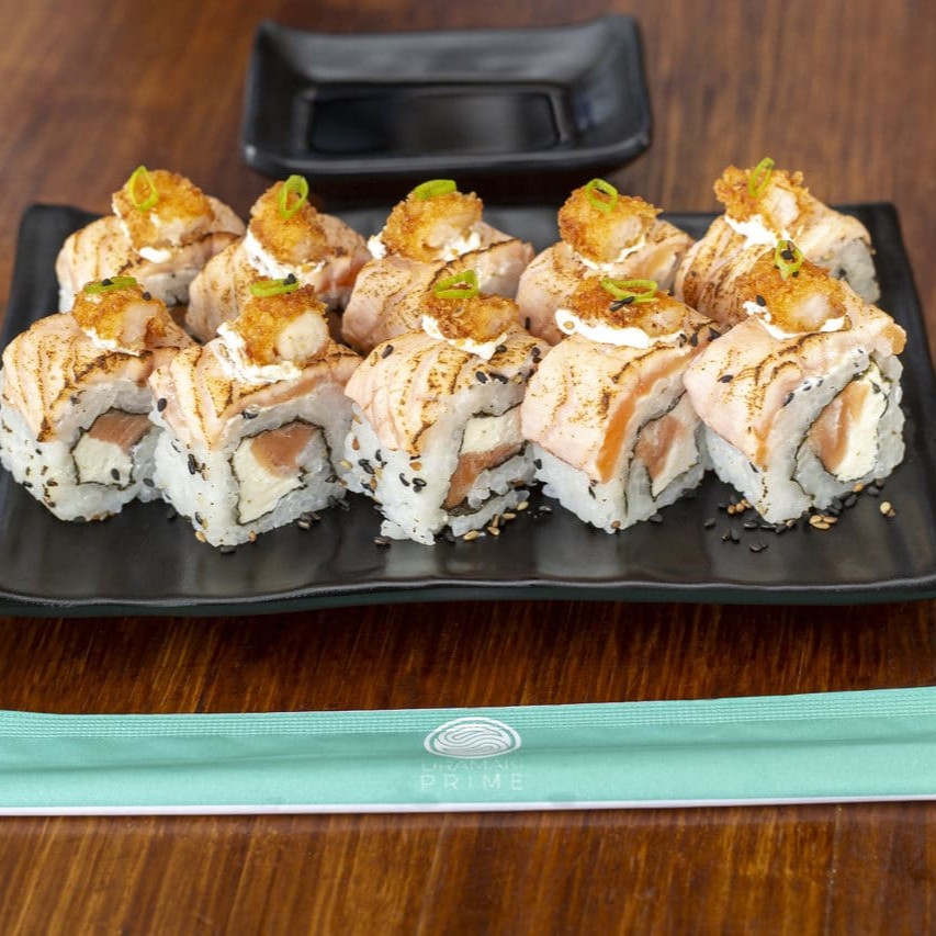 Uramaki de salmão coberto com uma capa de salmão maçaricado e um toque de camarão empanado.