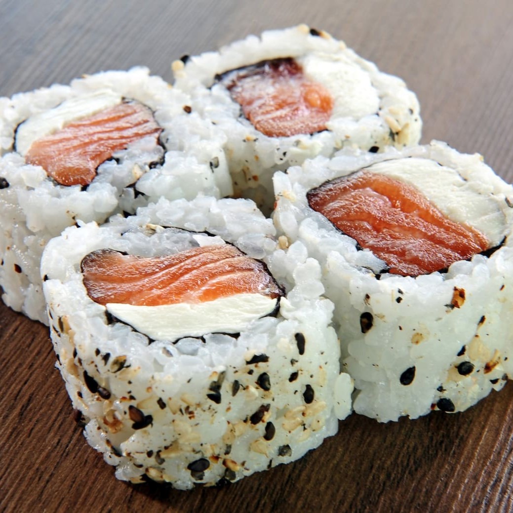 Roll composto de arroz por fora, gergelin e recheio por dentro, com cream cheese.