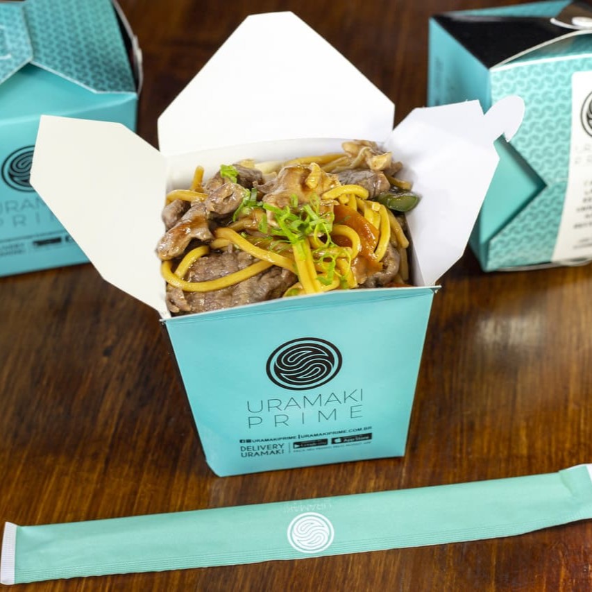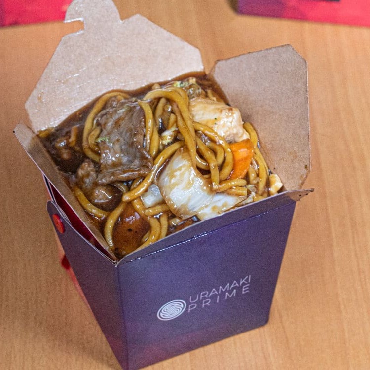 Macarrão frito servido ao molho com legumes selecionados, carne e frango. Yakisoba padrão japones, com pouco molho.