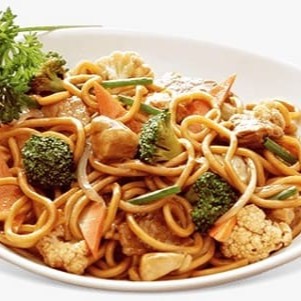 Macarrão frito servido ao molho com legumes. Obs: não leva molho de ostra. Contém ovo. Yakisoba padrão japones, com pouco molho.
