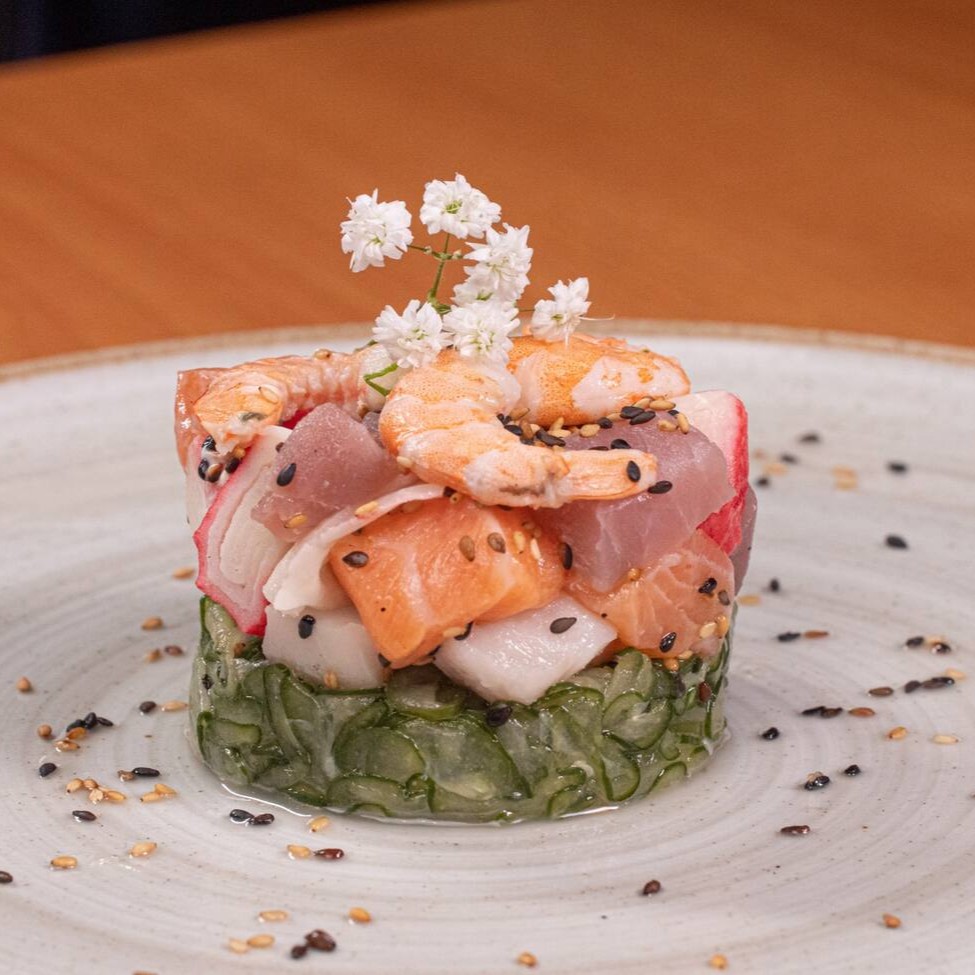 Entradinha a base de salada de pepino em conserva acompanhada com Salmão, Kani Kama, Peixe Branco e Camarão. (180g)