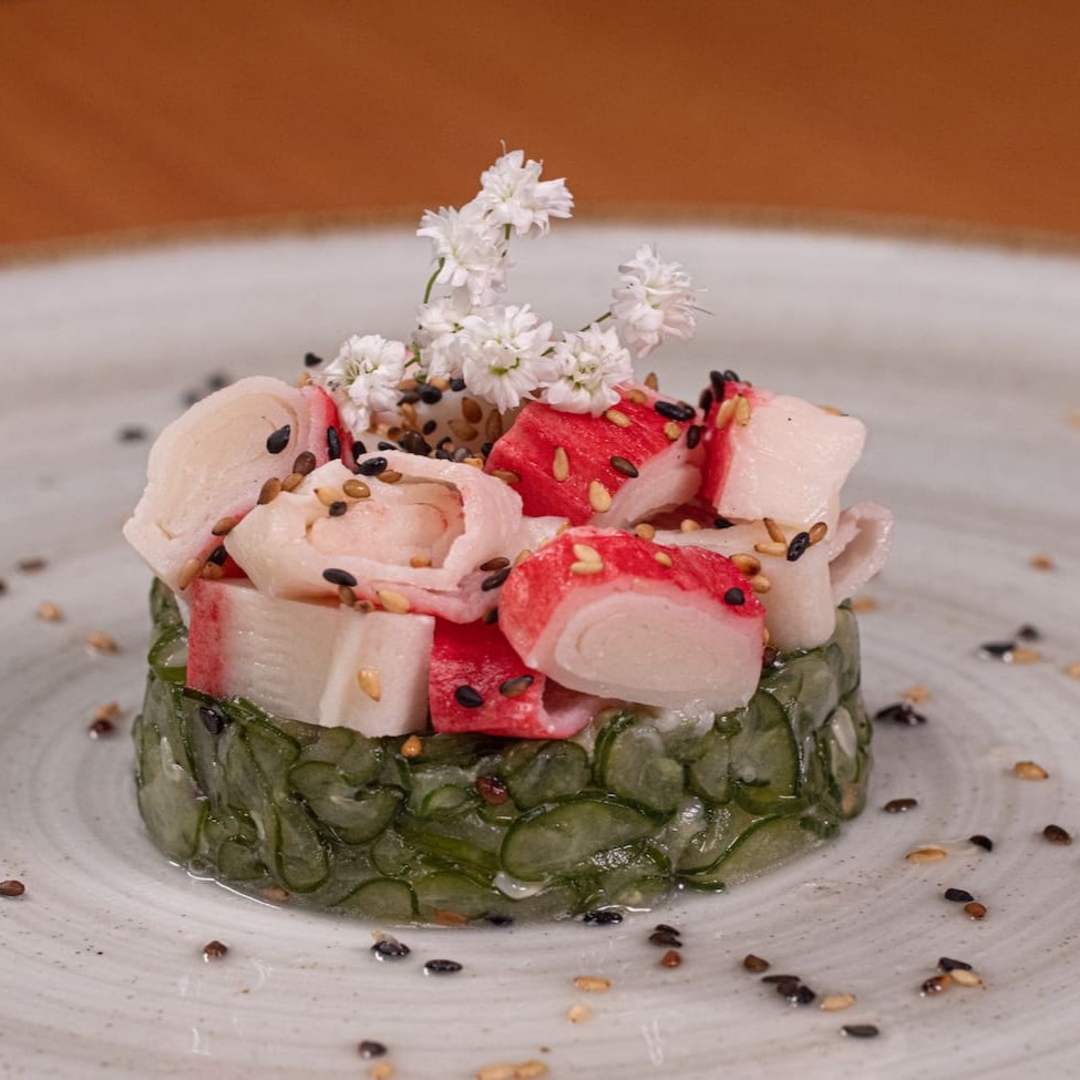 Entradinha a base de salada de pepino em conserva com pedaços de kani kama. (180g)