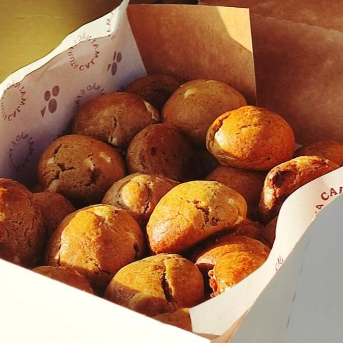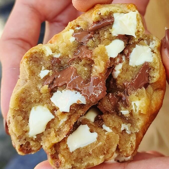 Nosso clássico. Massa tradicional com gotas de chocolate branco e ao leite.