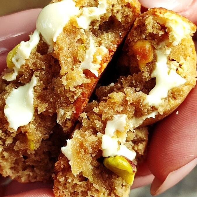 10 unidades de mini cookies de pistache com chocolate branco.