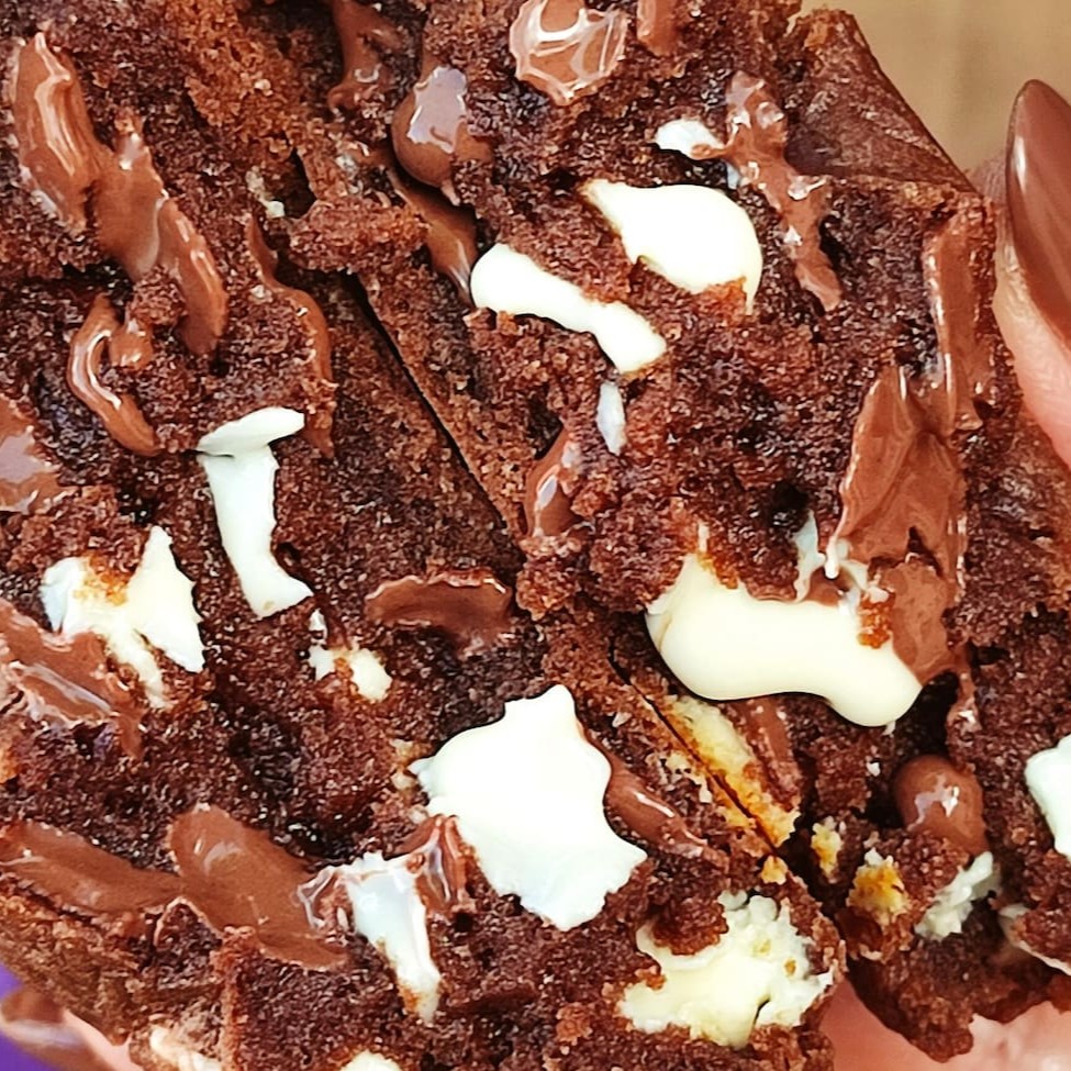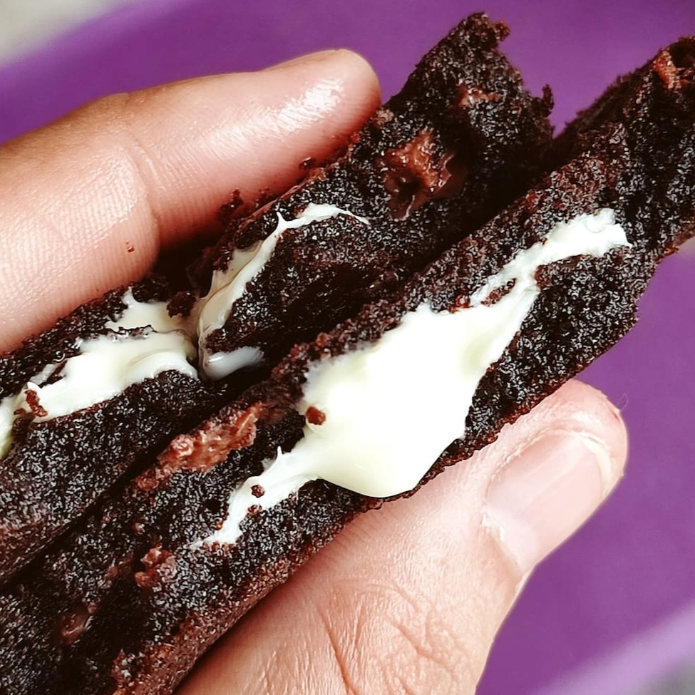 Nova versão do nosso cookie achatadinho: massa de chocolate com gotas de chocolate ao leite e recheado com chocolate branco.