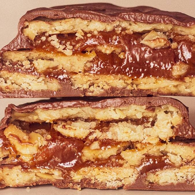 Sabe o Twix? Melhor que ele! Camadas de massa sablé com caramelo e coberto com chocolate ao leite.