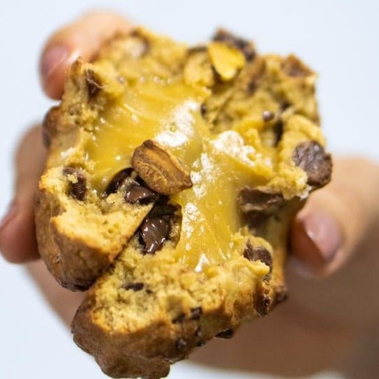 Feito com nossa massa tradicional, gotas de chocolate ao leite e meio amargo, recheado com muuito brigadeiro de pistache e finalizado com flor de sal.