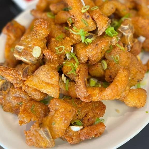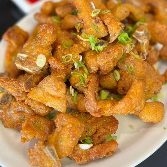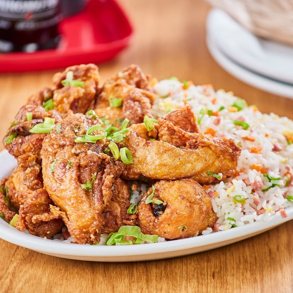 Tiras de bisteca de porco levemente empanadas ao alho e óleo + arroz chop suey