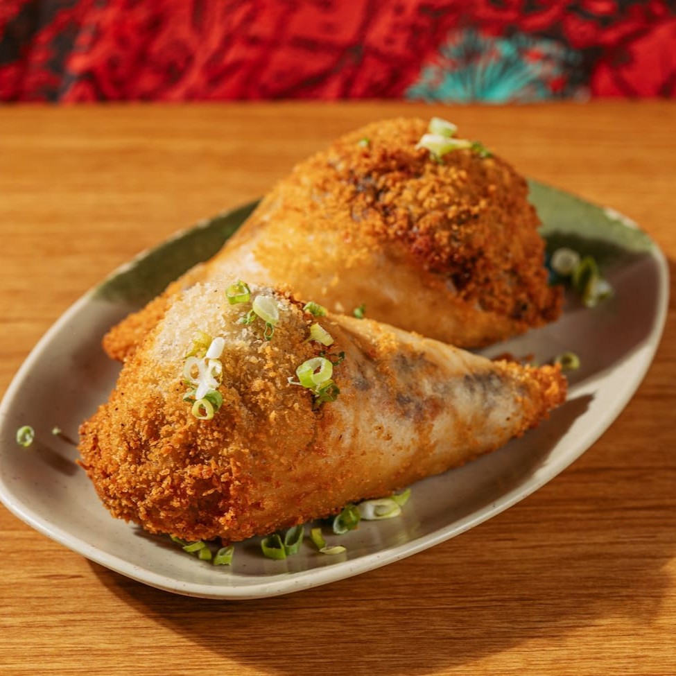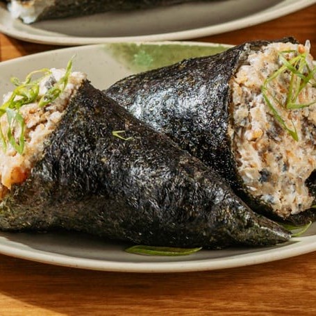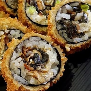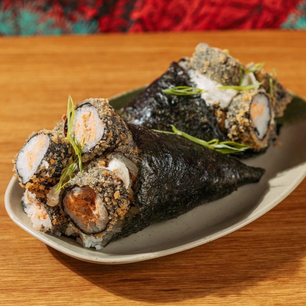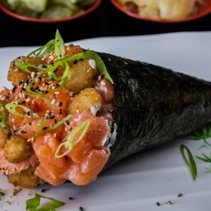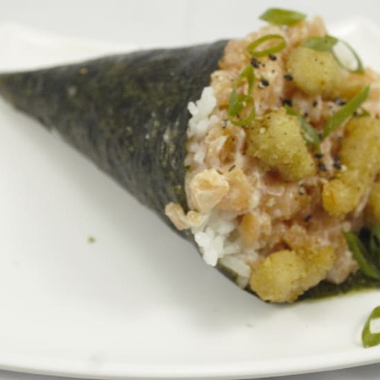 Arroz, pasta de salmão cozida e cream cheese, envolvidos na massa crocante e temaki inteiro frito.
