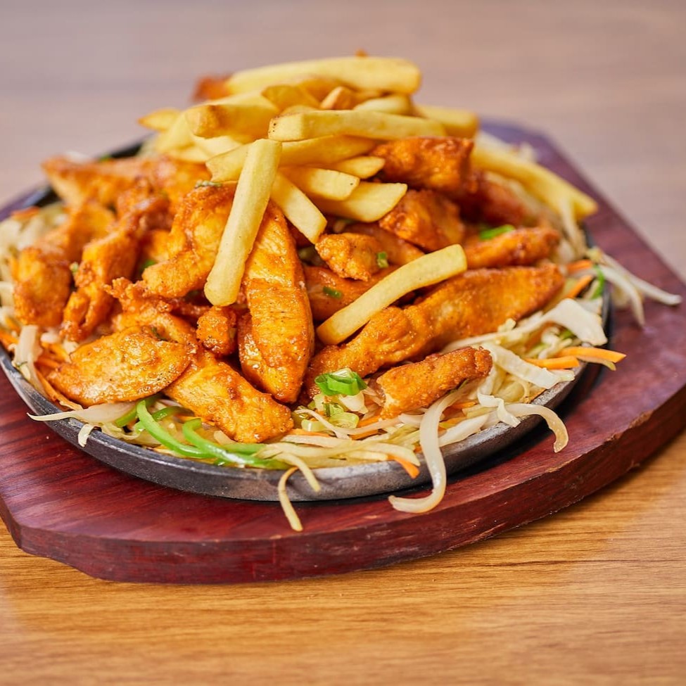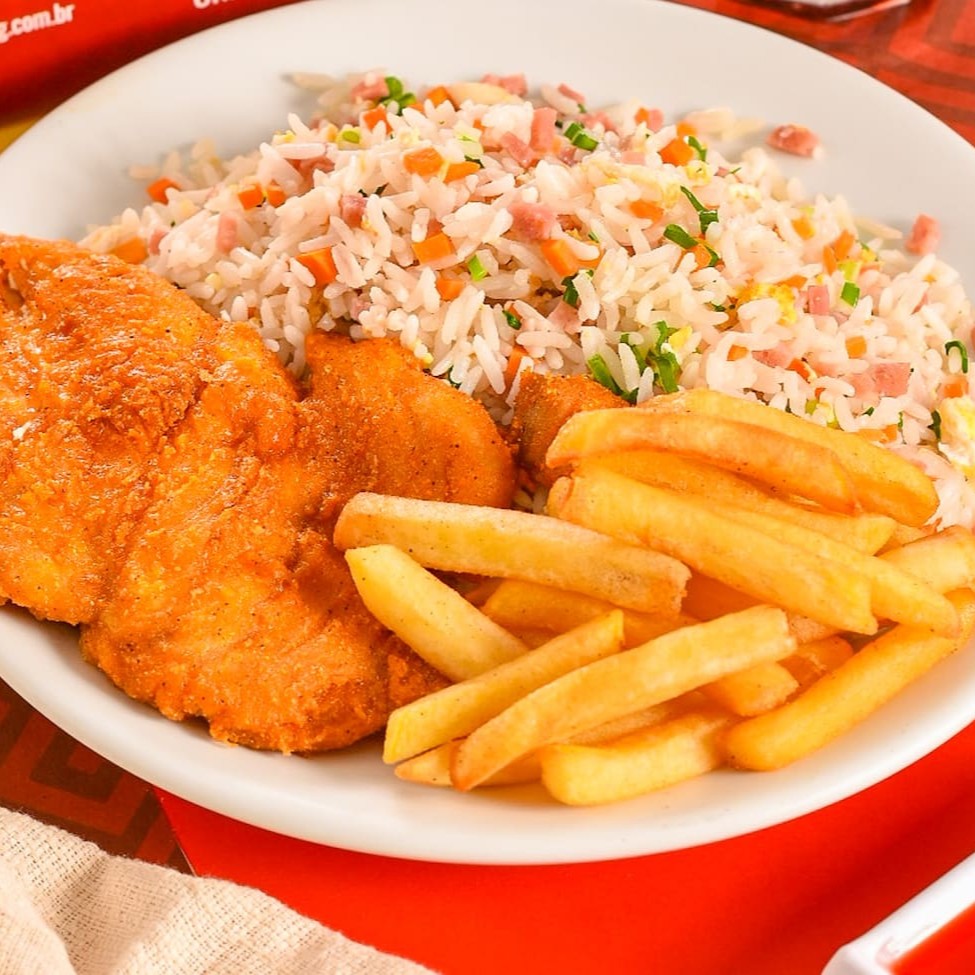 Individual: Frango empanado com: 4 unidades. Acompanha: Arroz chop suey e batata frita.