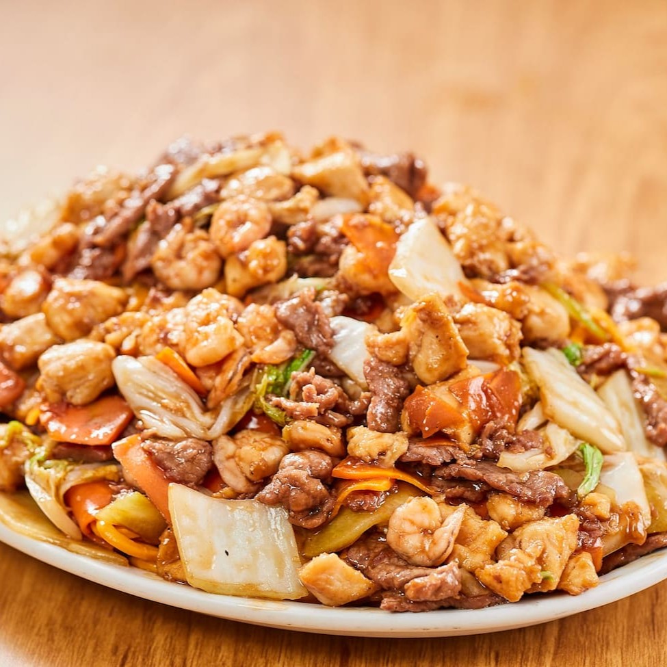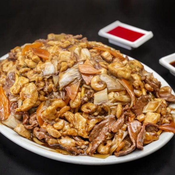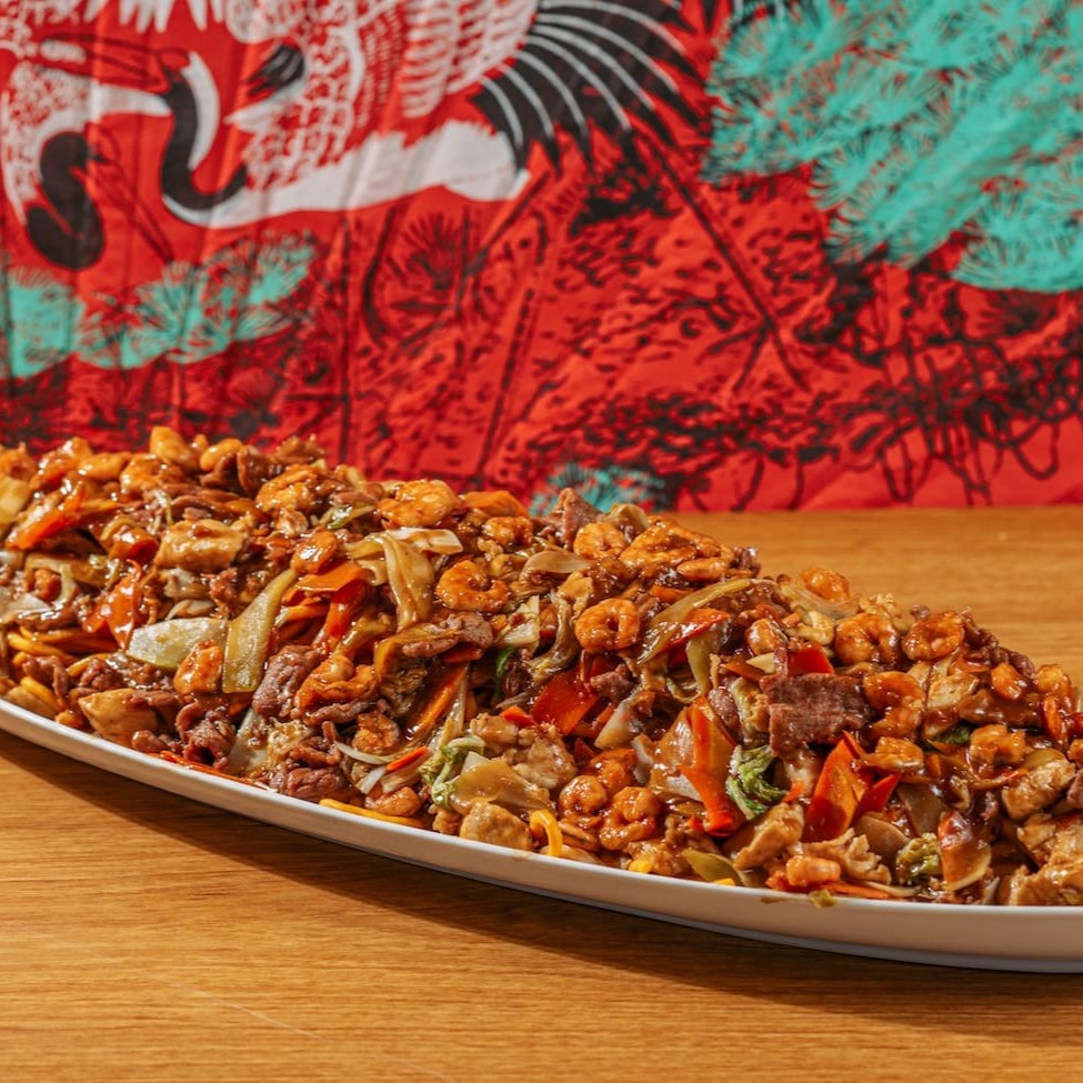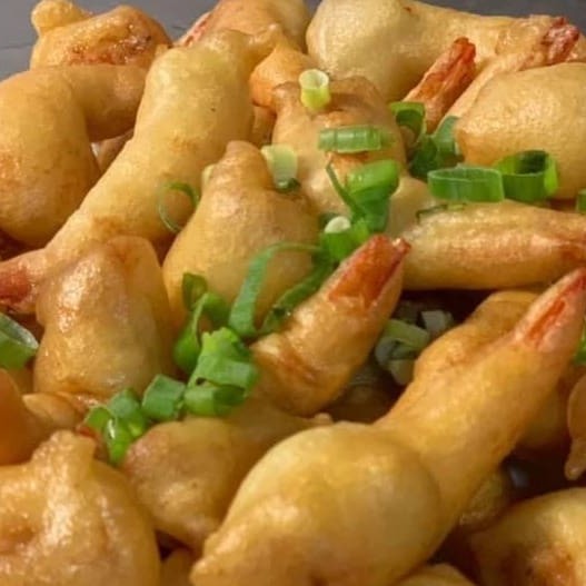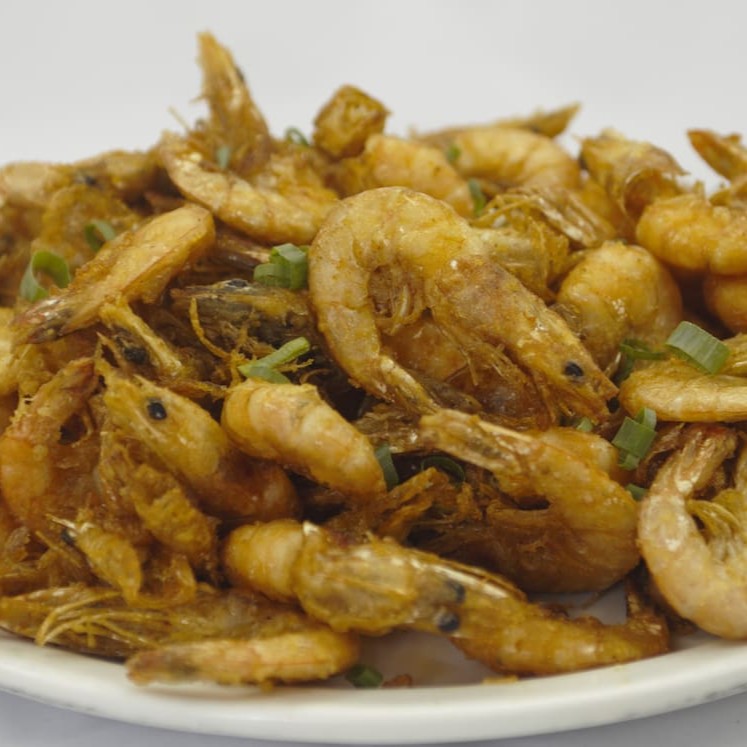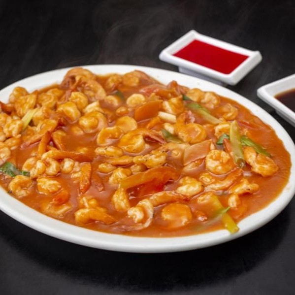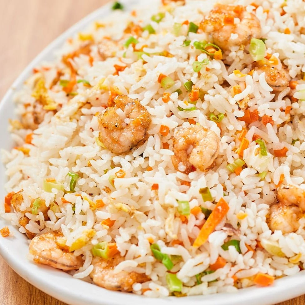Camarão médio ao molho de soja ou tomate, acompanhado de arroz chop suey