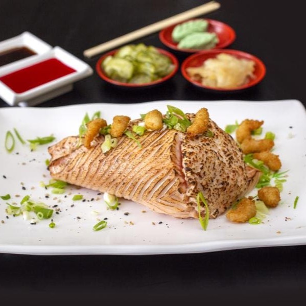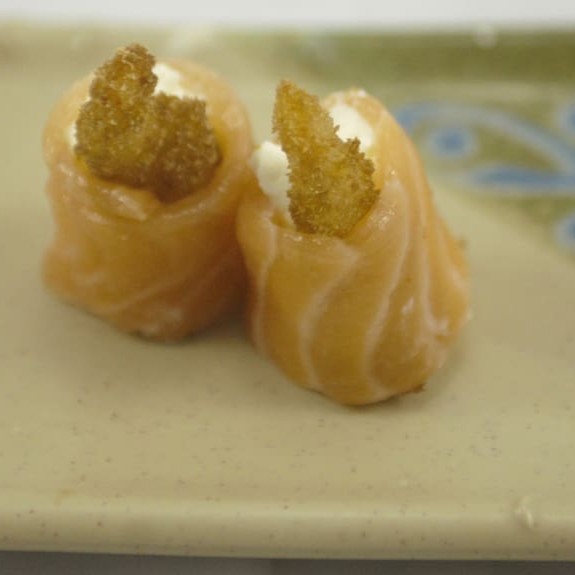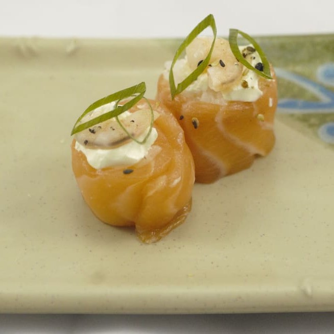 Manta de salmão maçaricado envolto no arroz, camarão empanado ou natural, salmão batido com cream cheese e cebolinho.