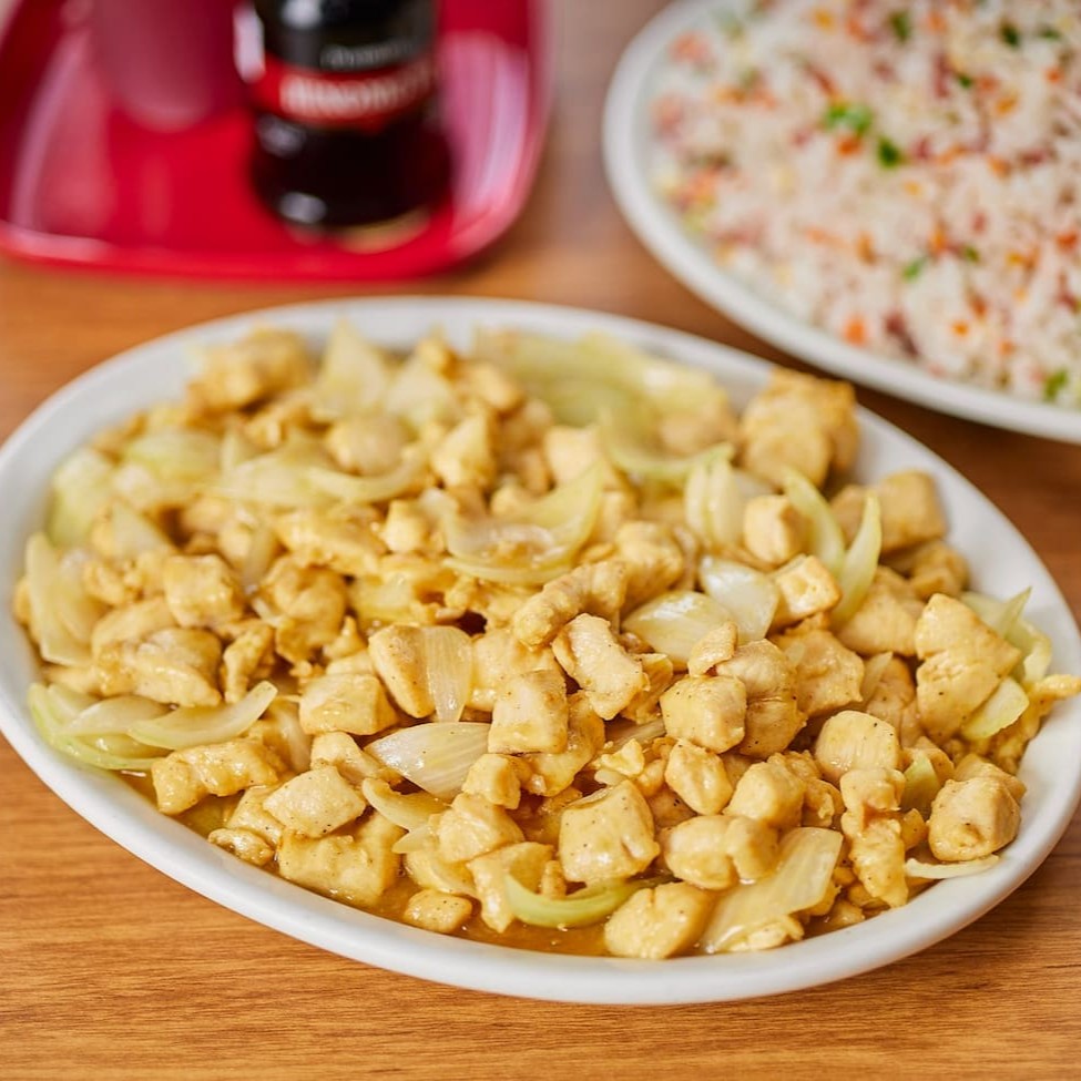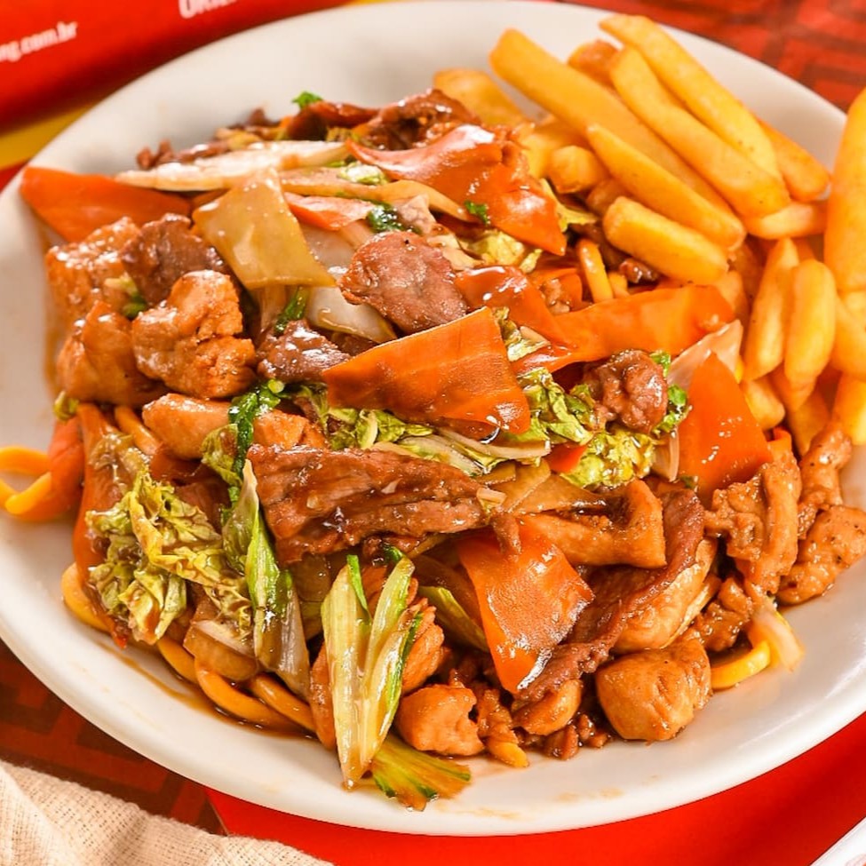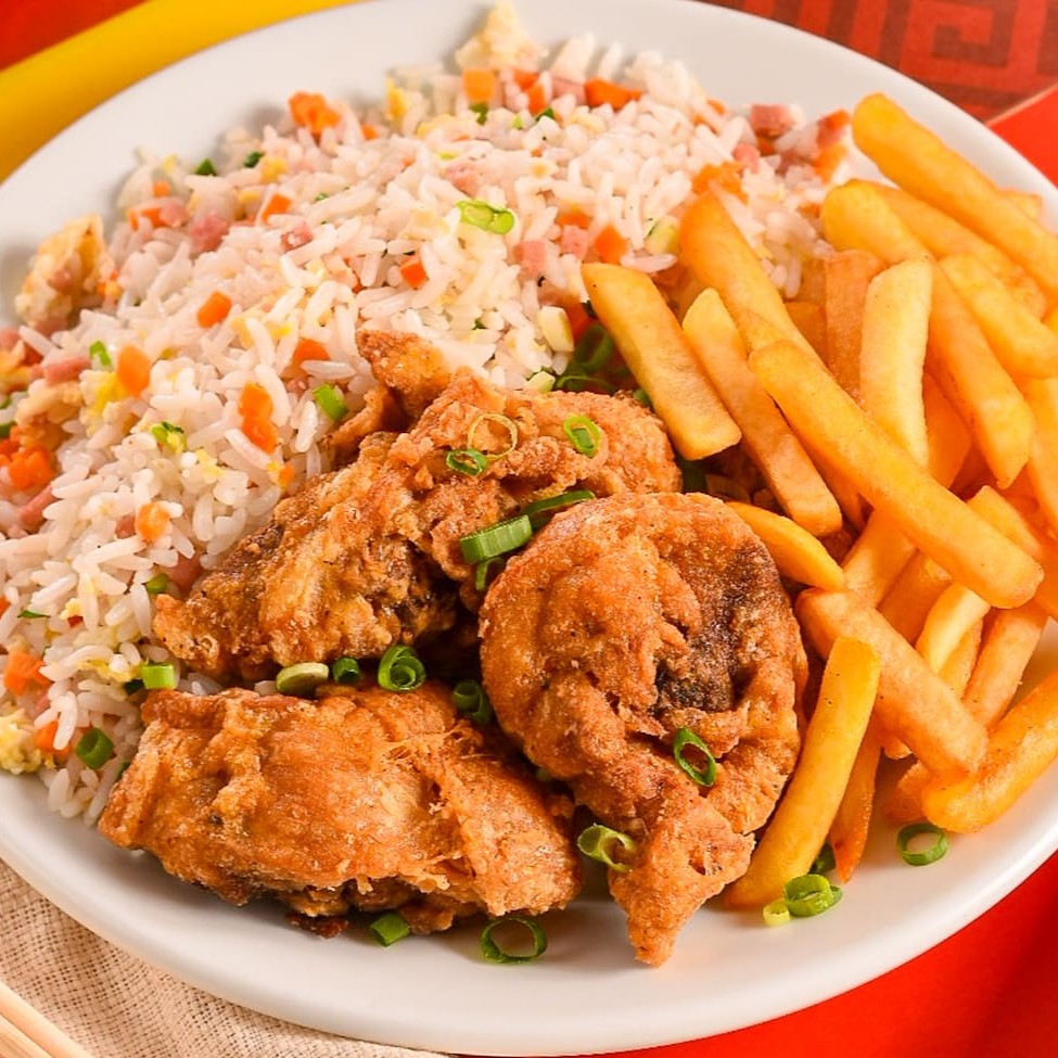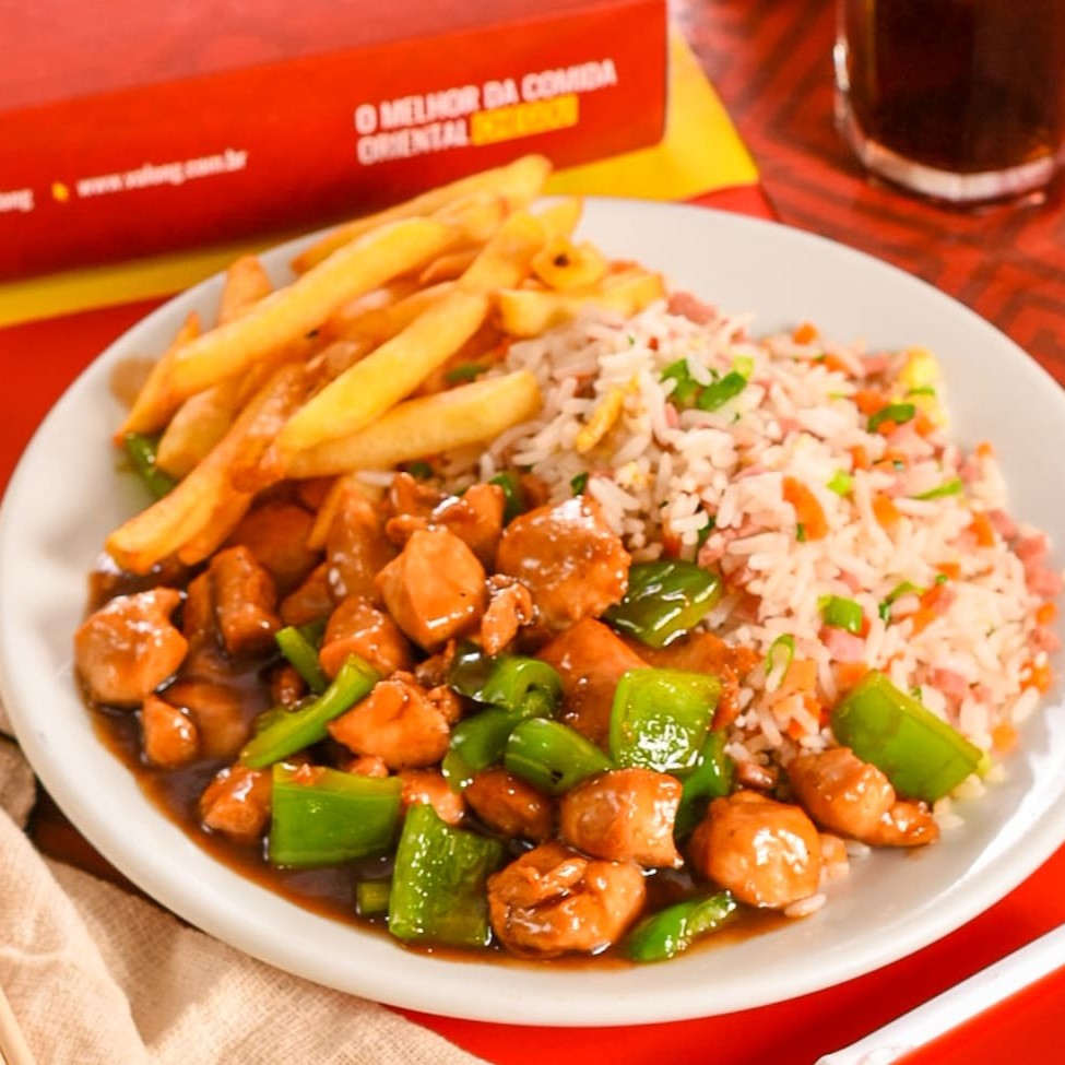 Individual: Frango xadrez, arroz chop suey e batata frita.