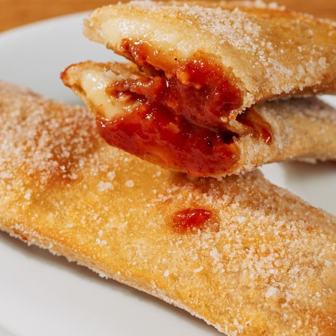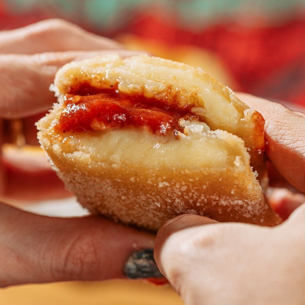 Massa fina crocante, recheada com queijo e goiabada.