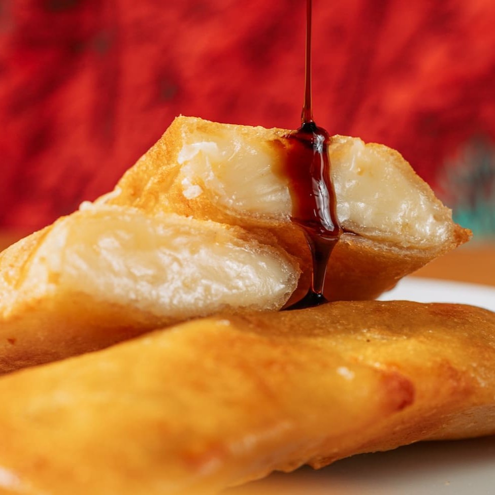 Massa fina crocante, recheada com queijo.
