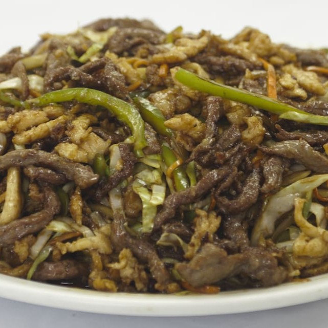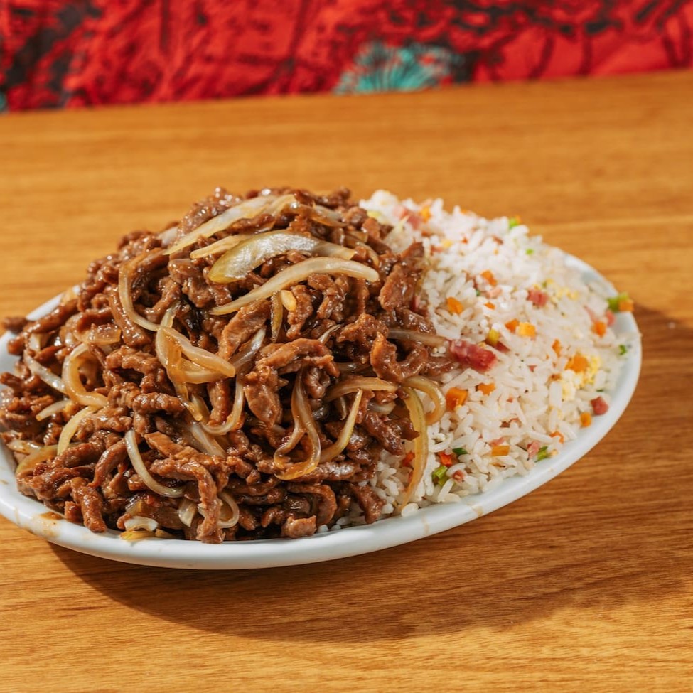 Individual: carne acebolada, arroz chop suey e batata frita.