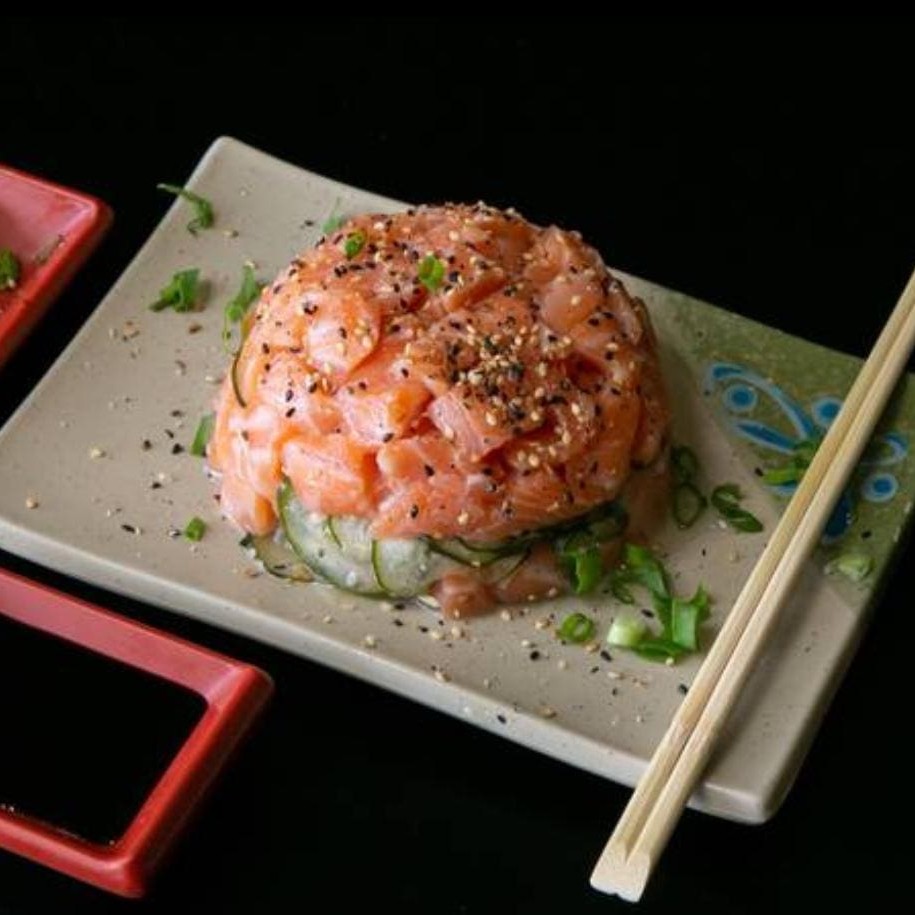 Cubos de salmão com pepino ao vinagrete e gergelim.