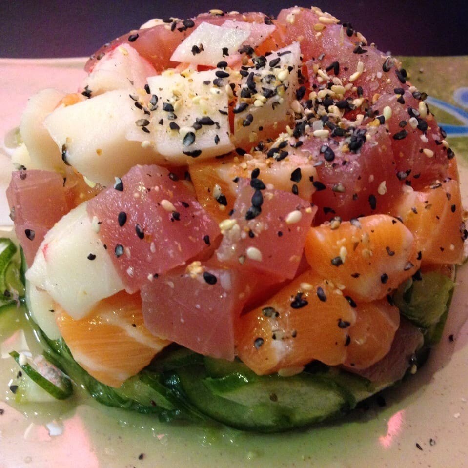 Cubos de salmão, camarão e kani ao vinagrete e gergelim.