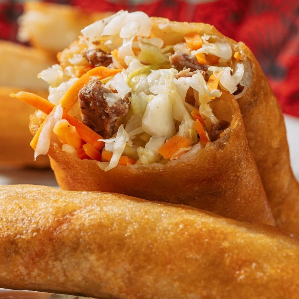 Massa fina crocante, recheada com carne, repolho e cenoura.
